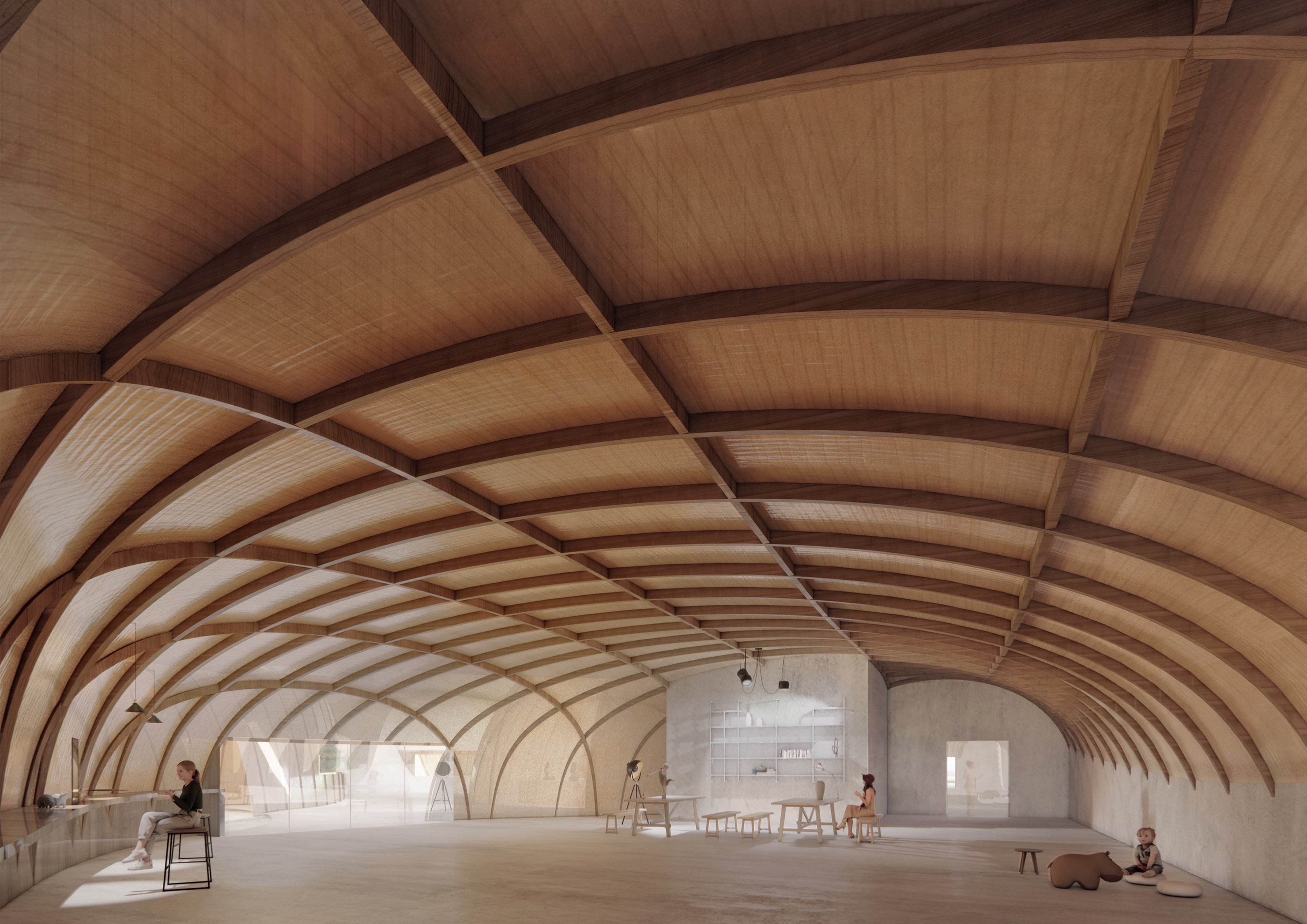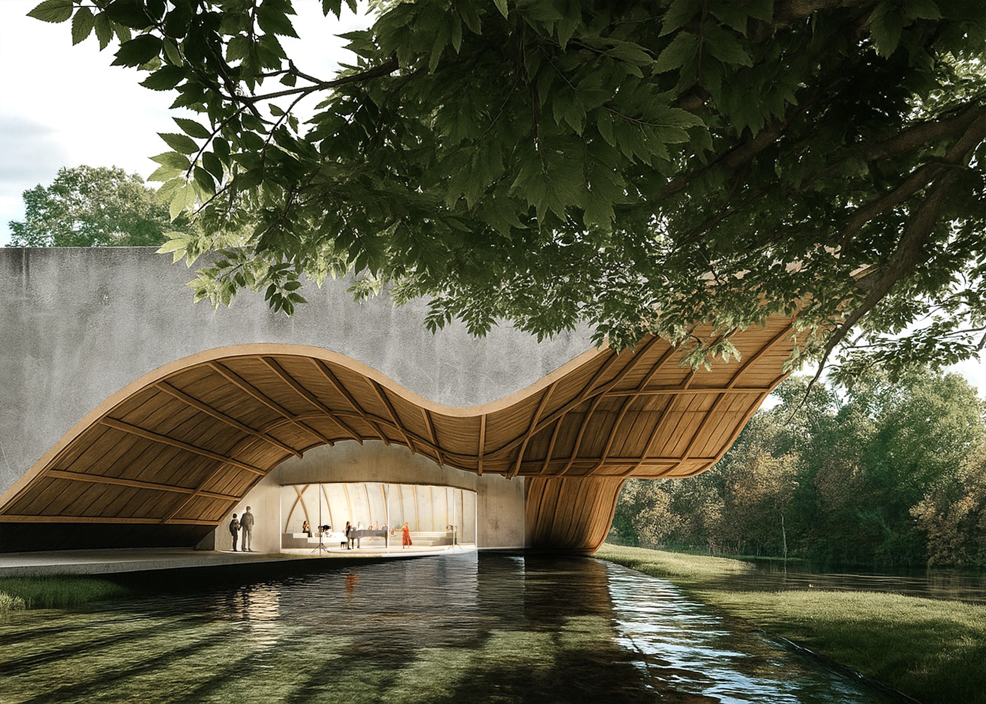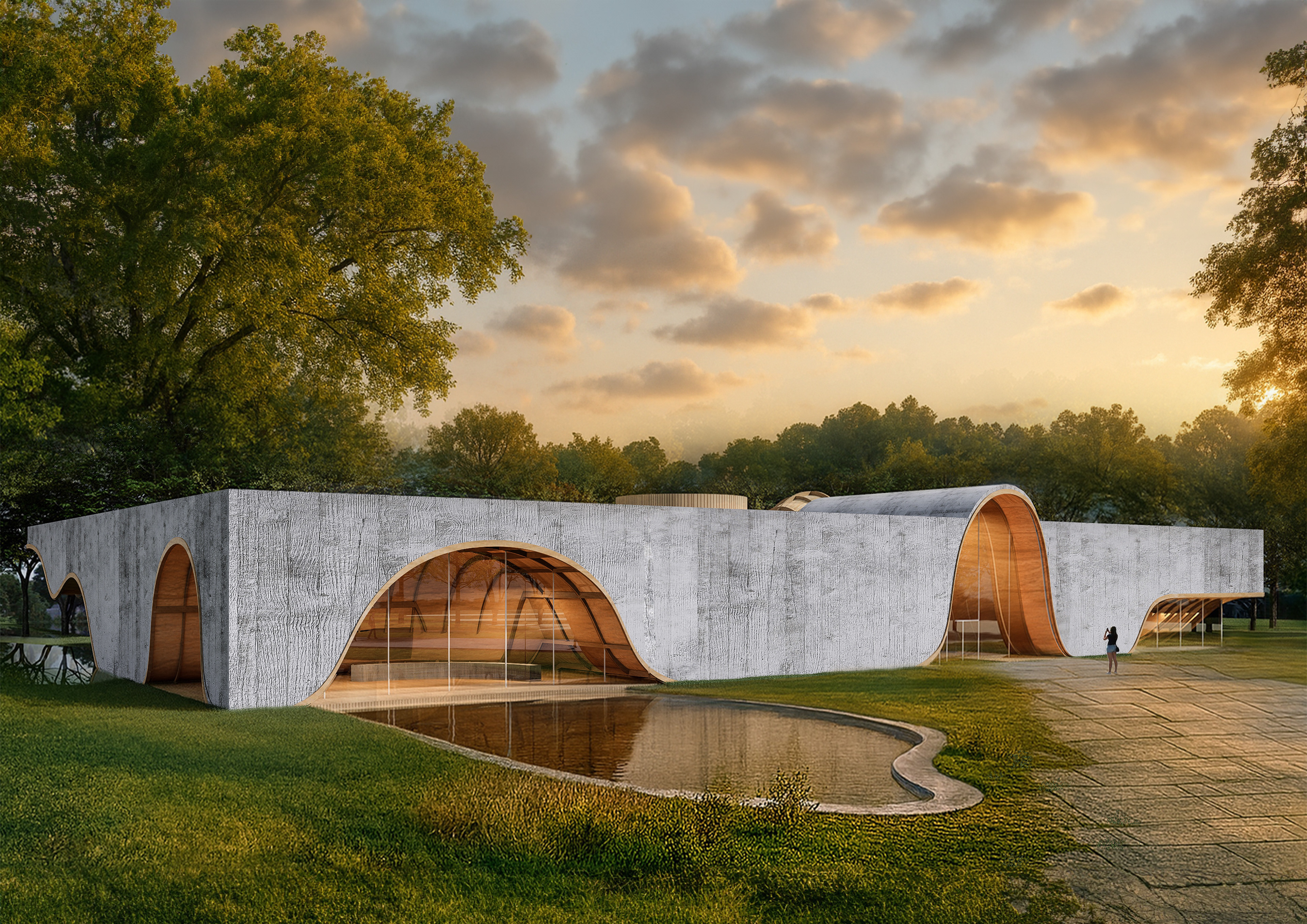 Inspired by the pivoting action observed when inflating and deflating a balloon during the morsal-folly finding process, this design transitions from a linear system to a central collection zone. The spherical volume's subtraction is preserved as the main exhibition space and entrance, emphasizing internal circulation. The pivot path creates a continuous exhibition space from west to east, with workshops on either side and a concluding immersive lake experience. The linear grid represents the strings, informing the curved roof structure. Visitors are guided by the concrete box, experiencing varied spatial sensations from the wood interiors.