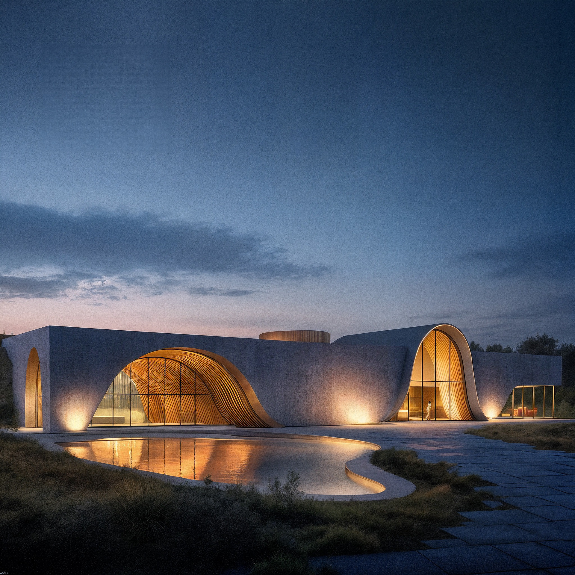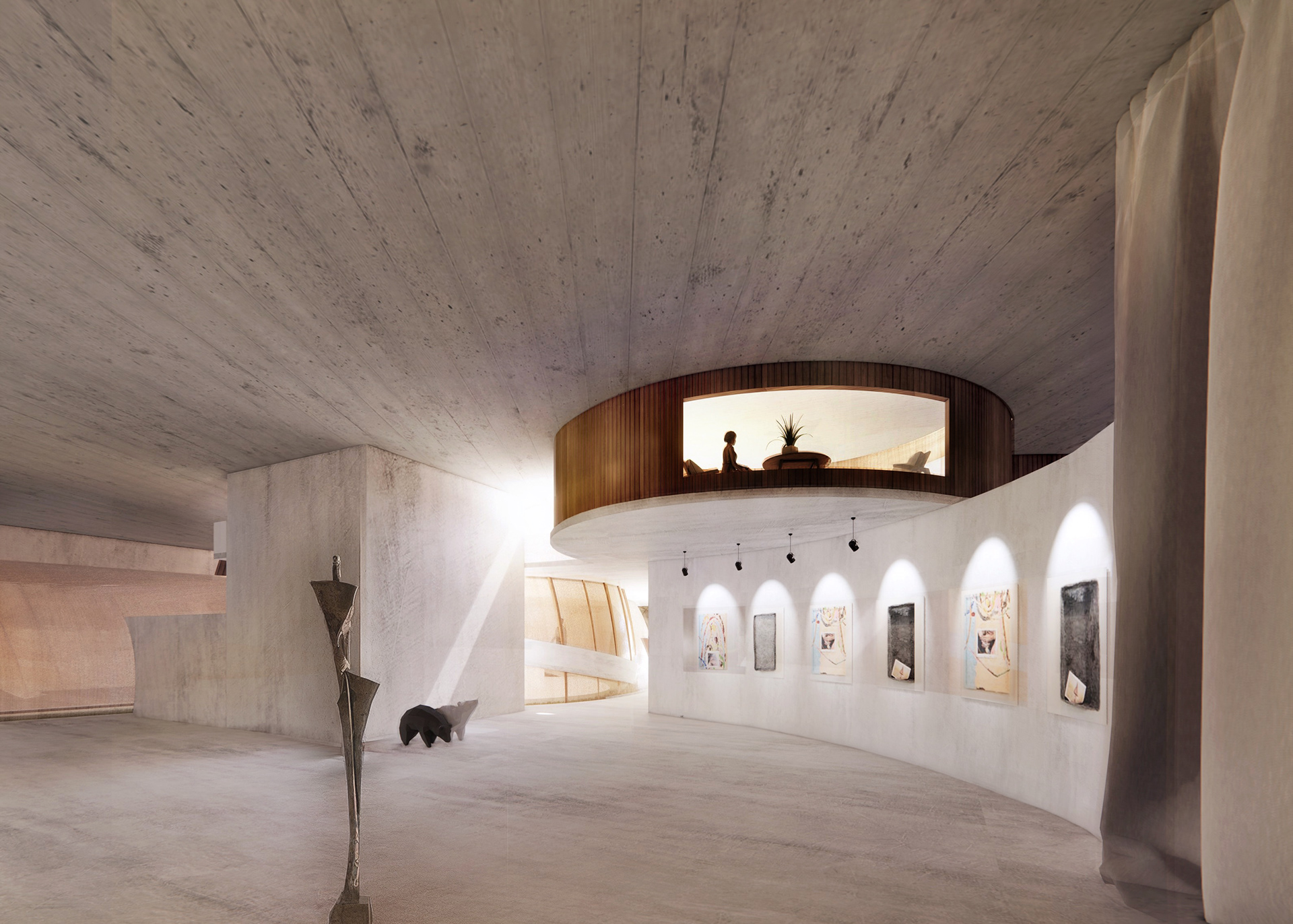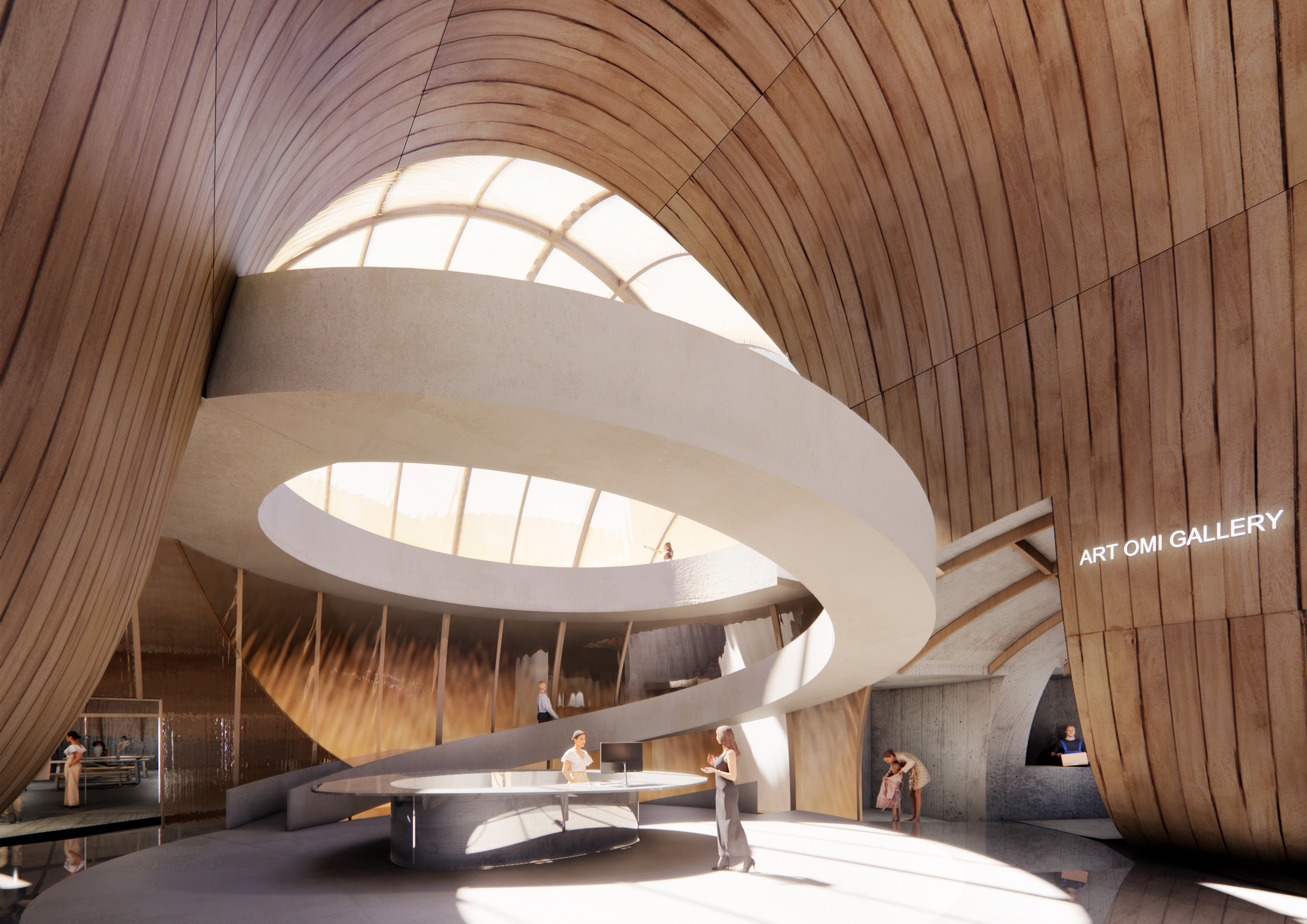 Inspired by the pivoting action observed when inflating and deflating a balloon during the morsal-folly finding process, this design transitions from a linear system to a central collection zone. The spherical volume's subtraction is preserved as the main exhibition space and entrance, emphasizing internal circulation. The pivot path creates a continuous exhibition space from west to east, with workshops on either side and a concluding immersive lake experience. The linear grid represents the strings, informing the curved roof structure. Visitors are guided by the concrete box, experiencing varied spatial sensations from the wood interiors.