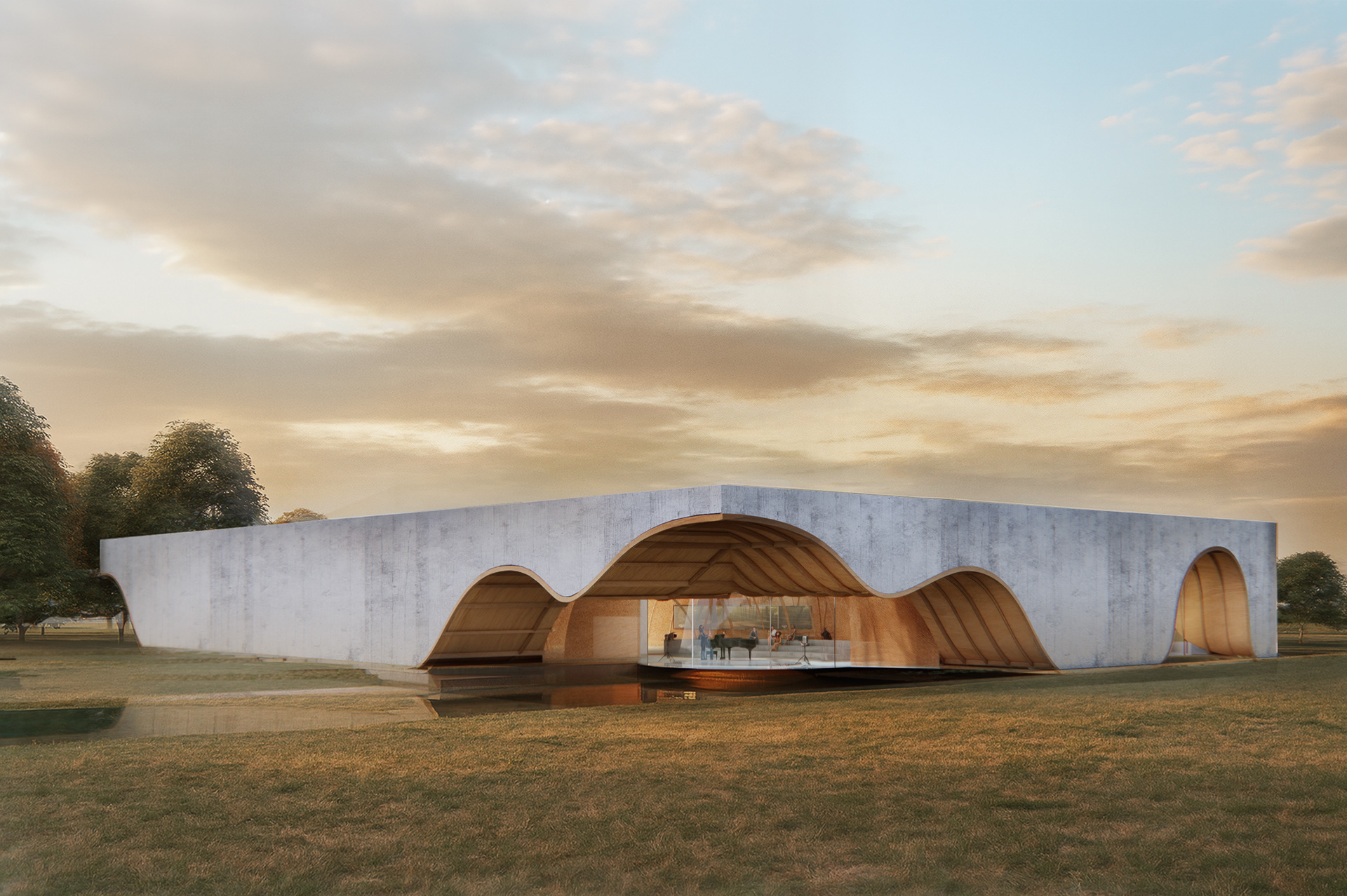 The regular linear grid, representing the strings, informs the design of the bent curved roof structure. Visitors are guided through a carved concrete box, experiencing varied spatial sensations from the wooden interior. The all-wood timber structure is visible from the inside, revealing the building's construction process.